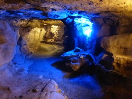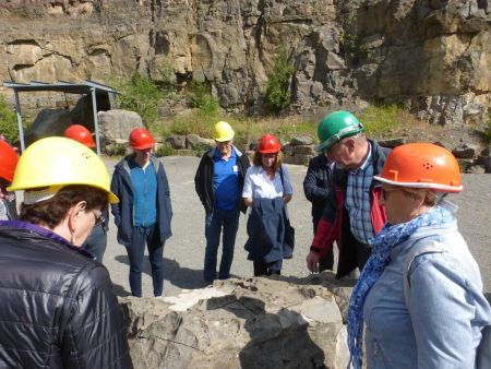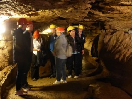 Vom sogenannten Huthaus, in dem alle mit Helmen ausgestattet wurden, ging es im gläsernen Aufzug 45 Meter in die Unterwelt. Auf der einminütigen Fahrt waren die verschiedenen Gesteinsschichten aus Millionen Jahren Erdgeschichte zu betrachten. In der 1992 bei Sprengarbeiten entdeckten, gut ausgebauten Höhle gab es bei einer Temperatur von 8° Celsius immer wieder neue Aha-Erlebnisse, vor allem, als der Höhlenführer die eher grauen Steine mittels Schwarzlicht in leuchtende farbige Edelsteine verwandelte.
