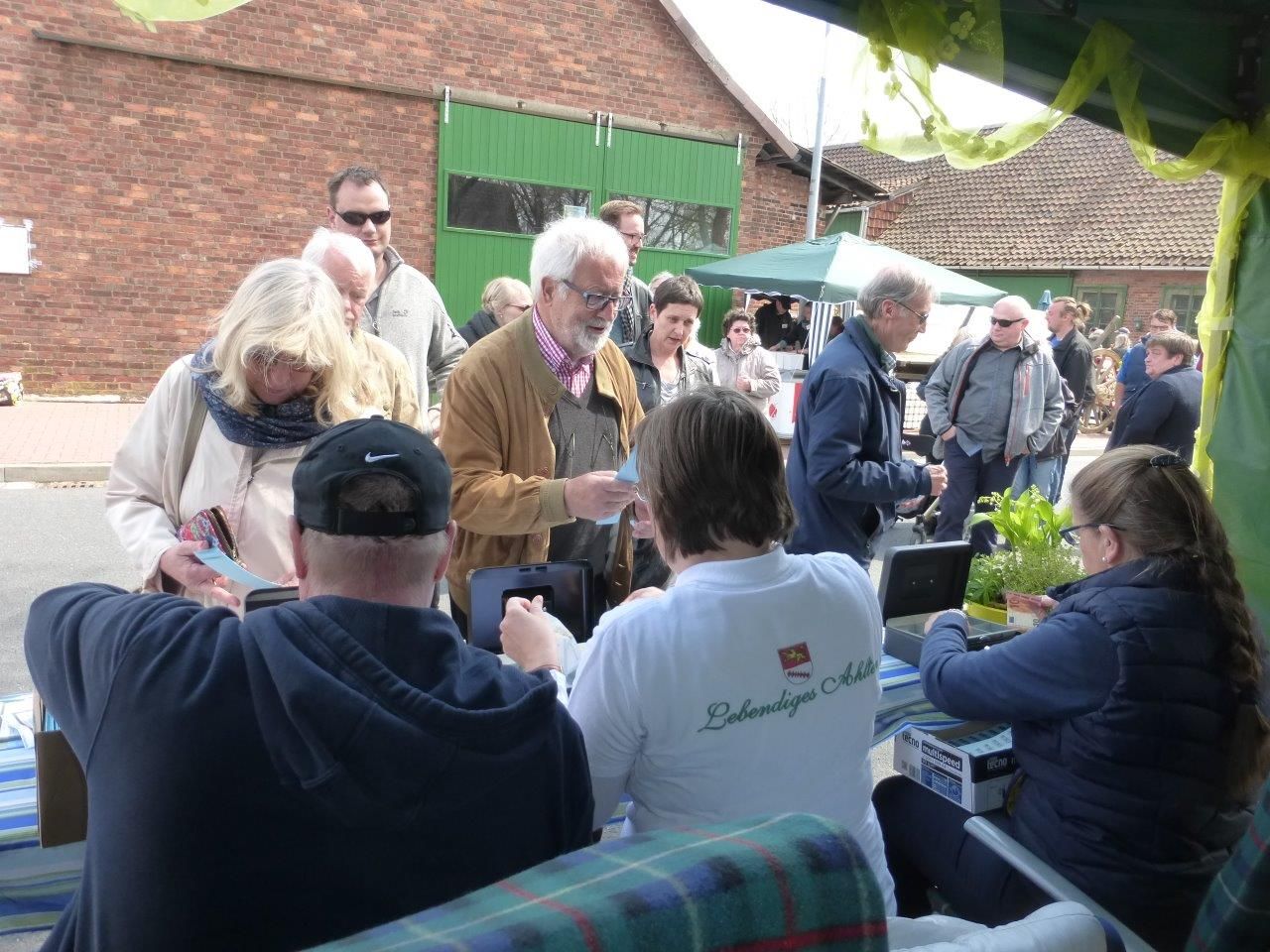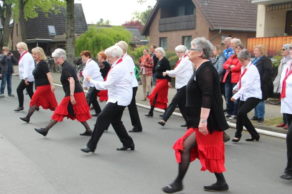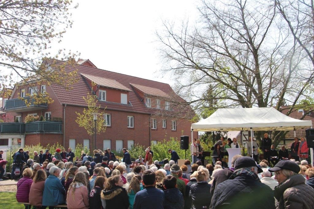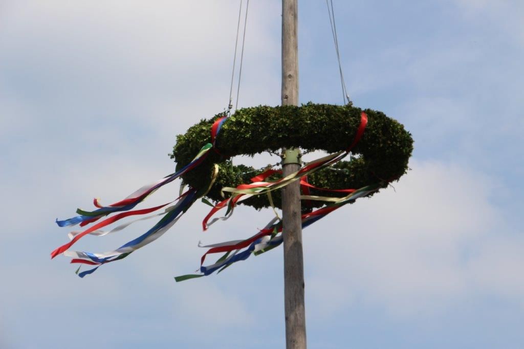 Der Kranz war von den Frauen des Vereins Lebendigen Ahlten in liebevoller Handarbeit gebunden und geschmückt worden; die starken Männer des Vereins hatten ihn in luftige Höhe gehoben. So überstrahlt der Maibaum nun den Festplatz Am alten Dorfteich. Das achte Ahltener Maifest konnte beginnen.