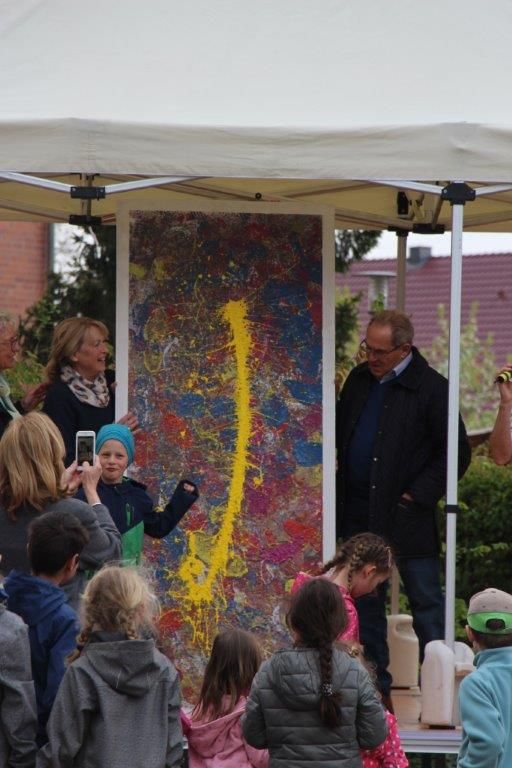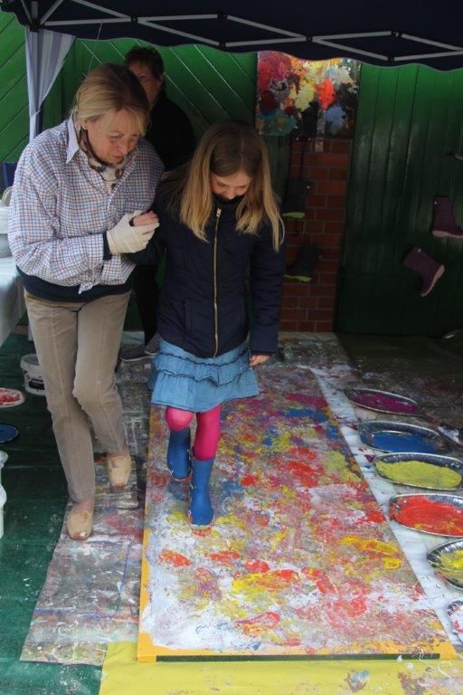 Bunt ging es auch beim Stand des Künstlertreffs zu. Die meist kleinen Kinder konnten mit Gummistiefeln ein großformatiges Bild in den allerschönsten Farben „malen“. Ein schöner Erfolg: Das fertige Ergebnis der „Füßlimalerei“wurde später für 150 € versteigert.