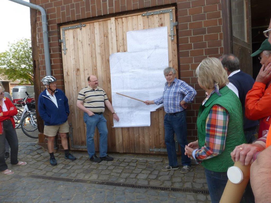 Vor dem Start an Prüßes Pferdestall erläuterte Hans Henning Brandes an einer kurzerhand von Hartmut Kost beigesteuerten großformatigen Karte den Verlauf der Grenze. Die Anwesenheit von Ortsbürgermeister Jürgen Kelich veranlasste Ursel Prüße vom Lebendigen Ahlten zu der launigen Bemerkung, dass nun einmal dem Bürgermeister seine Grenzen aufgezeigt werden. Der nahm dies nicht nur schmunzelnd zur Kenntnis, sondern bewies durch fachkundige Anmerkungen, dass er die Grenzen seines Herrschaftsbereichs durchaus gut kennt.