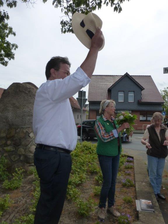 Die Begegnung fand vor dem Denkmalstein in der Ortsmitte statt, um den es in der Vergangenheit eine fast „kriegerische“ Auseinandersetzung zwischen den Bürgern beider Ortschaften gab. Die sich darum rankende Geschichte nimmt sowohl in der vom Verein Lebendiges Ahlten herausgegebenen Ahltener Chronik als auch in der von der Stadt Lehrte herausgegebenen Geschichte Aligses einen breiten Raum ein. Obwohl sich die Ahltener damals geschlagen geben und den ihnen einst versprochenen Stein letztlich den Aligsern überlassen mussten, schmückt ein Bild dazu sogar den Einband der Ahltener Chronik. Natürlich konnte sich Seger eine Anspielung auf den historischen Aligser Sieg nicht verkneifen, zeigte sich aber – ebenso wie die Ahltener - nicht nachtragend ob dieses lange begrabenen Konflikts. Zur Bekräftigung gab es für Ursel Prüße ein Blumensträußchen und für Seger ein Fläschchen Ahltener Rübenschnaps.
