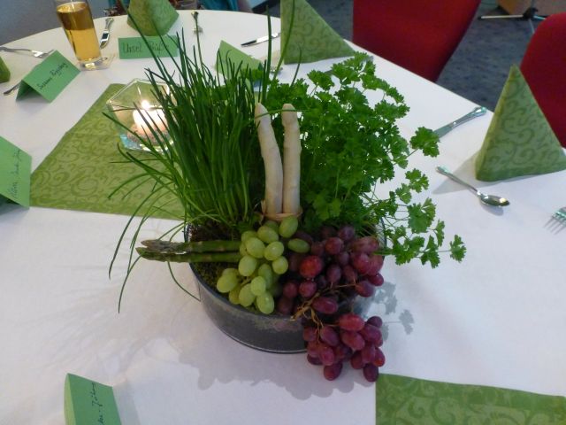 Nette und interessante Gespräche und ein gutes Glas Wein ließen die Zeit bis zur Überraschungs-„Gästin“ wie im Fluge verstreichen. Dabei wurde auch die mit viel Liebe von Barbara Hörstmann gestaltete Tischdekoration bewundert, die aus Kräutern, Spargel und Trauben bestand.