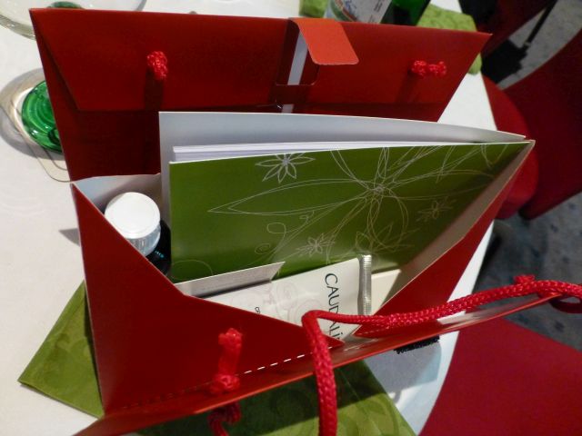 Im Anschluss an den sehr interessanten Vortrag erhielten alle Frauen ein kleines rotes Täschchen, in dem sich eine Handcreme und ein Fläschchen Traubenkernöl befanden, zusätzlich eine kleiner Block, vielleicht um zu notieren, wie die schönen Dinge gewirkt haben?
